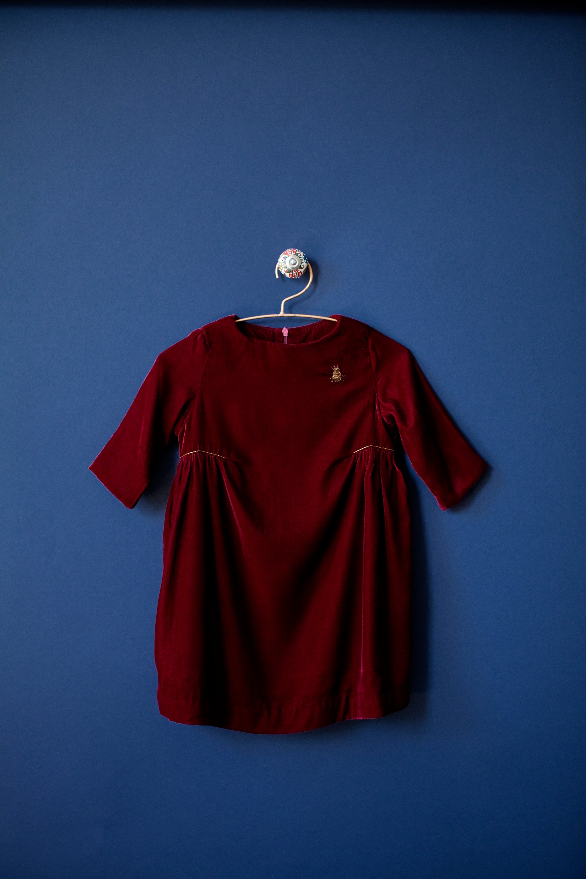 Finding a festive dress that balances elegance with a touch of playful charm is never easy—most options are either too plain or overly ornate. This velvet dress resolves that dilemma with its graceful boat neck, refined three-quarter sleeves, and side gathers illuminated by delicate gold embroidery. It offers your girl a polished silhouette without losing the sense of joy and individuality every child deserves.