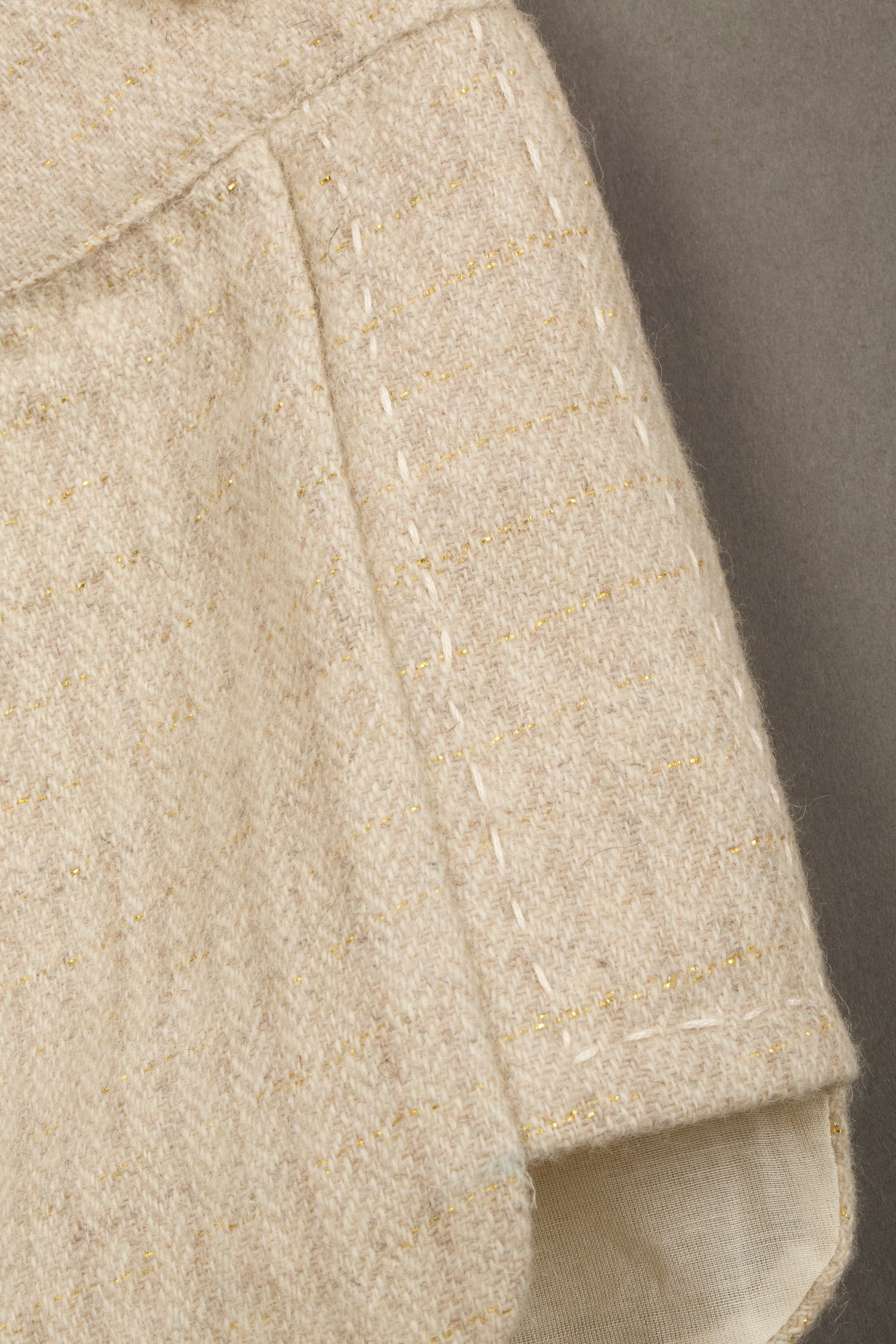 Crafted from a gold lurex wool fabric with a subtle textured weave, these shorts shimmer without being loud. The modal lining ensures a soft, non-irritating feel, while their structure balances durability and style—making them both festive and wearable.
