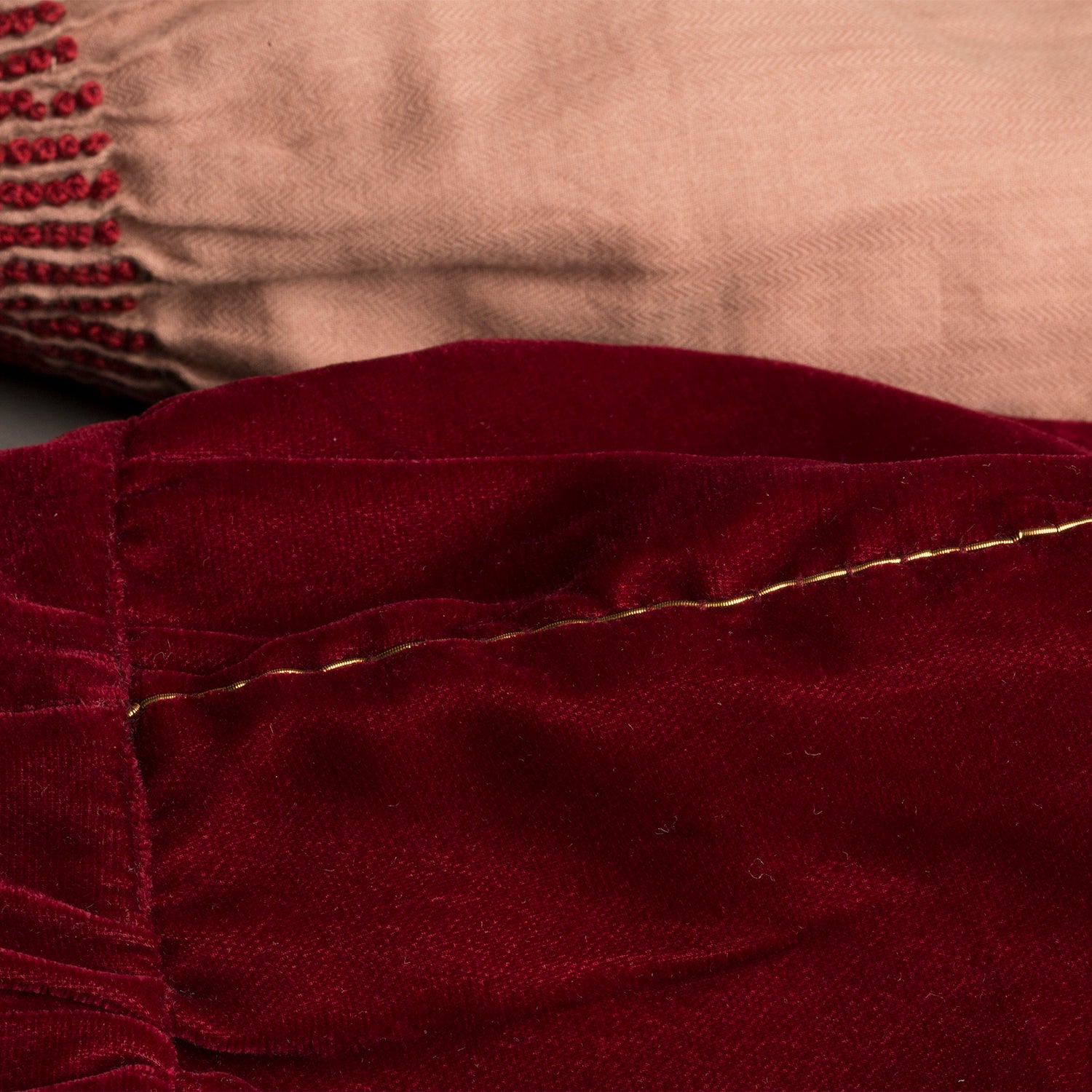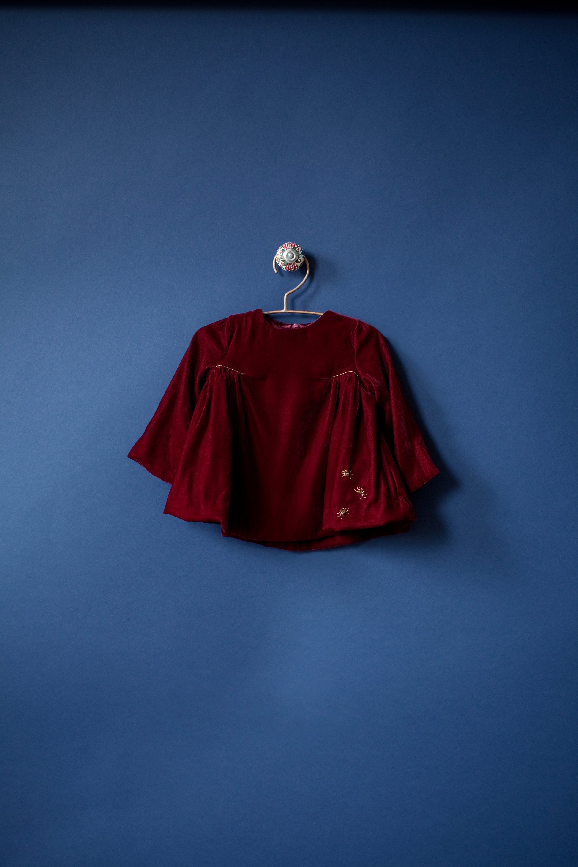 Some dresses are sweet—this one is unforgettable. Cut from sumptuous velvet and lined with whisper-soft satin, it is a special-occasion piece made for the girl who commands attention with ease. The gathered silhouette sways with quiet drama, while a concealed back zip preserves its refined finish. But the true allure lies in the hand-embroidered trio of golden spiders—symbols of creativity, patience, and inner strength.