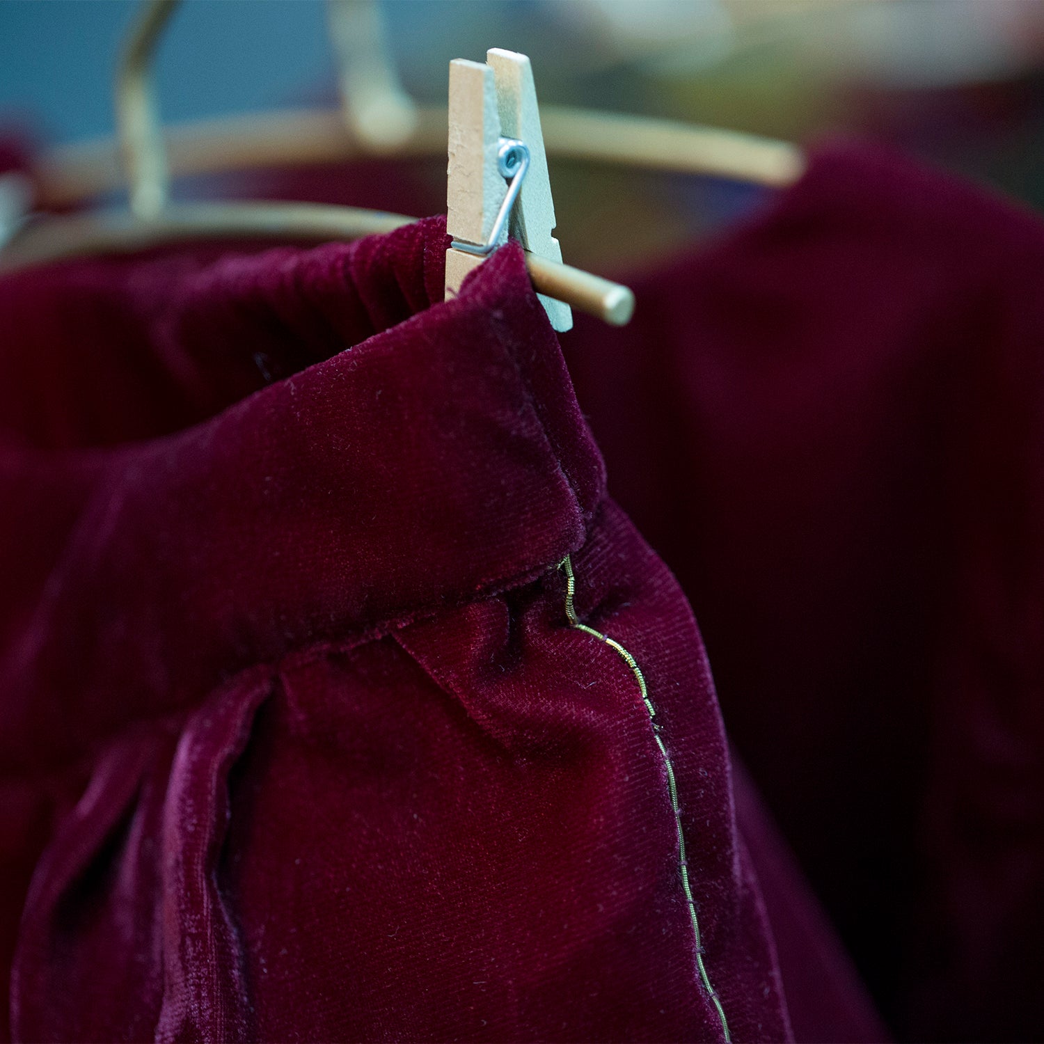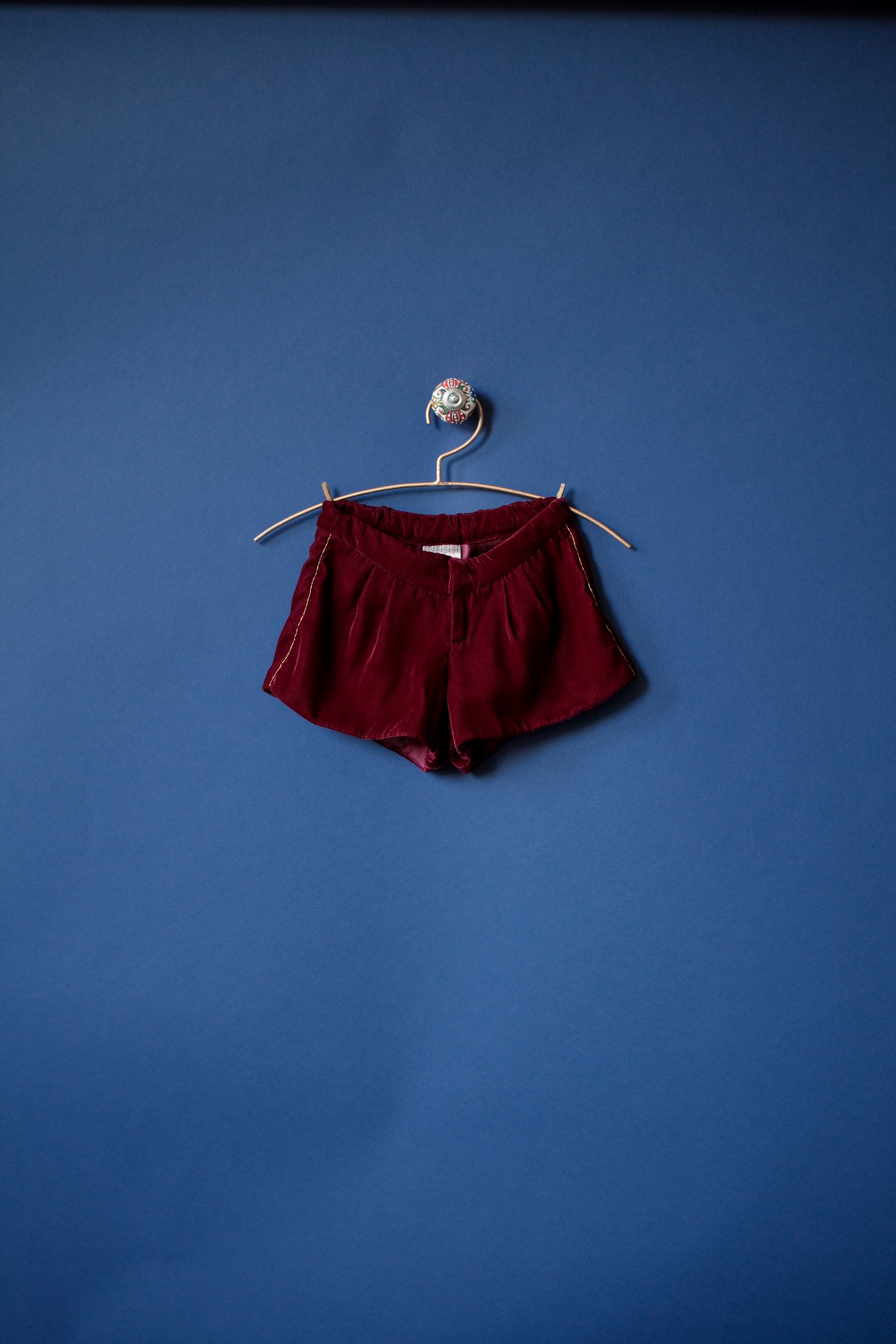 The embroidery is deliberately subtle—fine golden stitches that line the seams, adding a glow without overwhelming the velvet. It’s the kind of detail that rewards a closer look, giving her shorts just enough radiance for celebration time while keeping them refined.